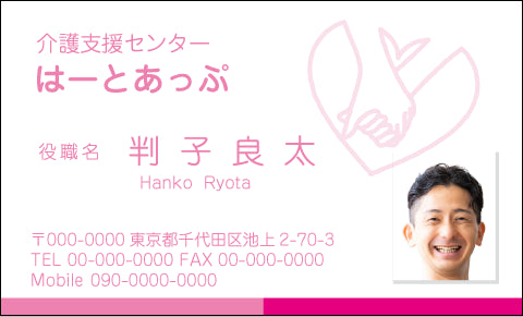 清潔感と安心感が最重要。淡い色や読みやすい書体で、やさしい印象に仕上げます。顔写真入りは利用者やご家族に信頼を伝えるため特に効果的です。